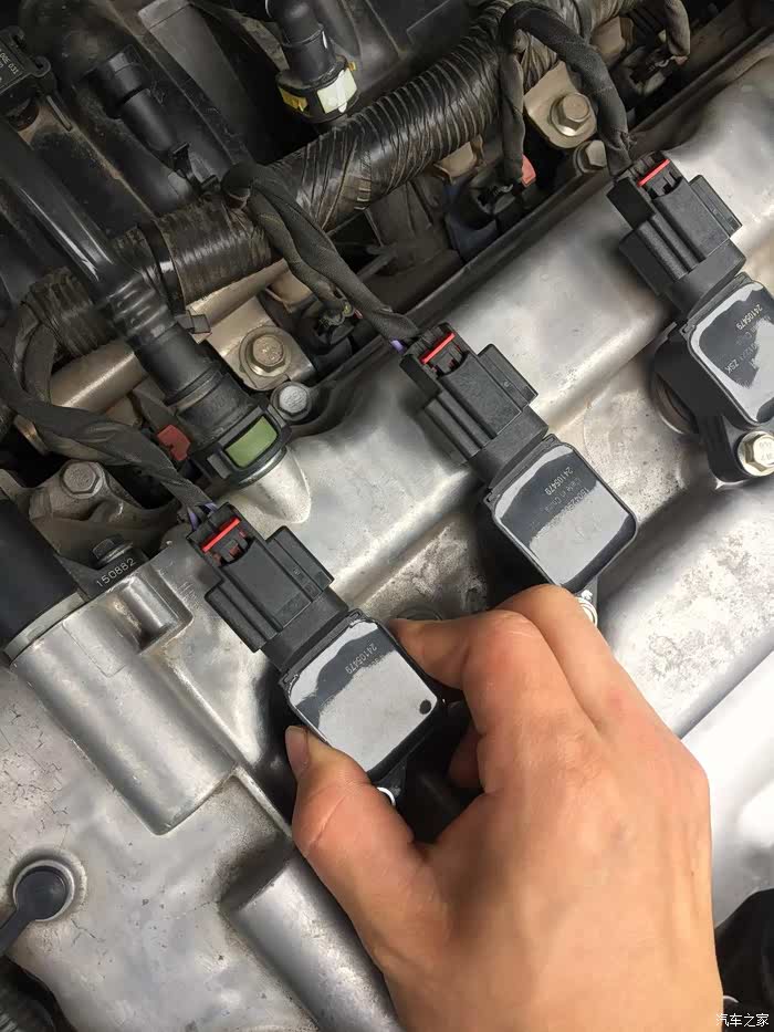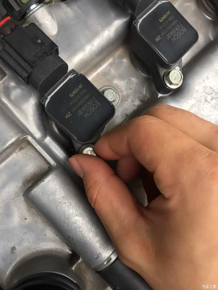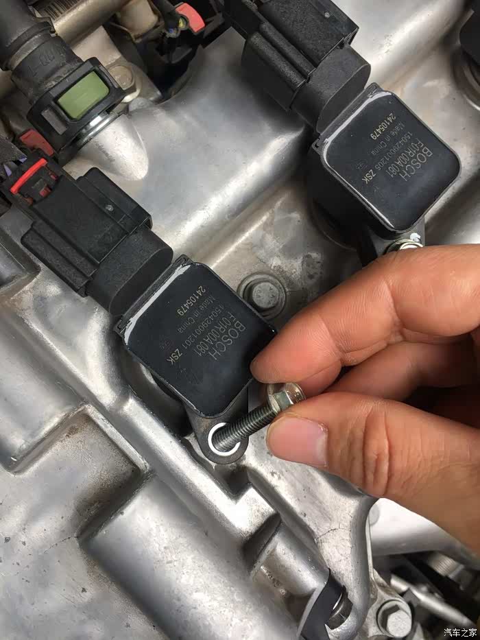 拧松后,一个一个更换火花塞,不要全部打开卸掉,以免灰尘和异物进入,先将第一个用手将已经拧松的螺丝取下,不要掉入发动机舱内