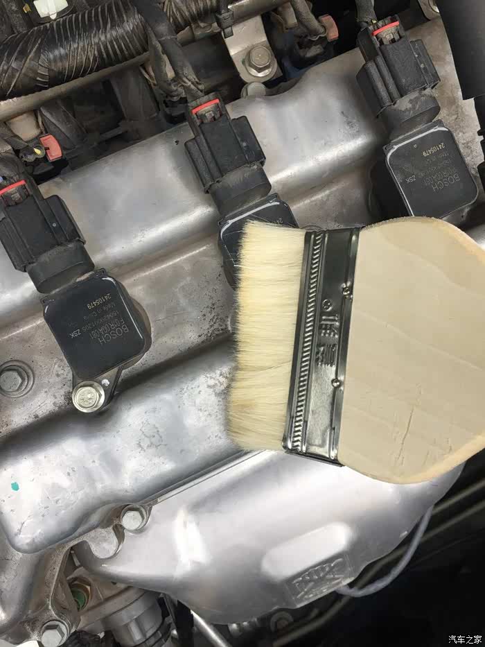 用刷子将上面的沙粒灰尘去除掉,以免在更换火花塞的时候掉入进去