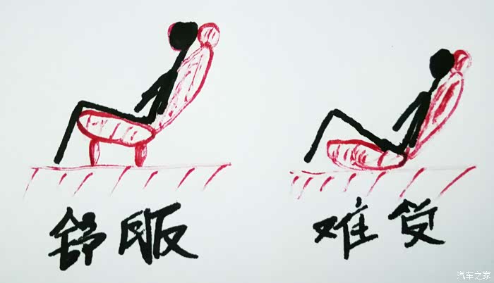 舒展的坐姿和憋屈的坐姿,注意坐垫高度的差别。舒展的坐姿一般会导致后排放倒后有台阶