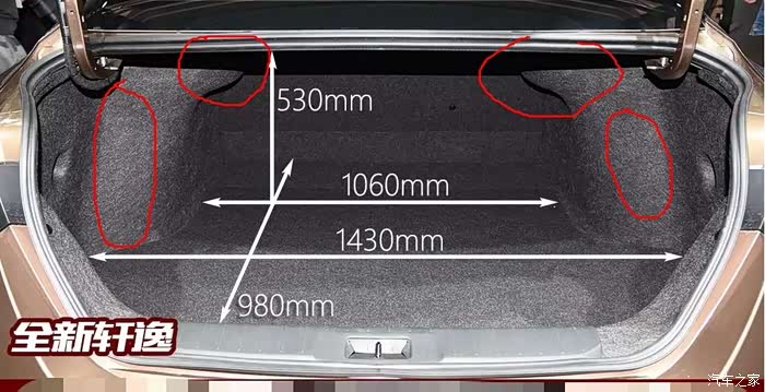 注意看后排座椅处,朗逸几乎是个正方形,而轩逸有两个明显的凸起,而且轮拱处特别厚,这可能就决定了有些物品放不进去。