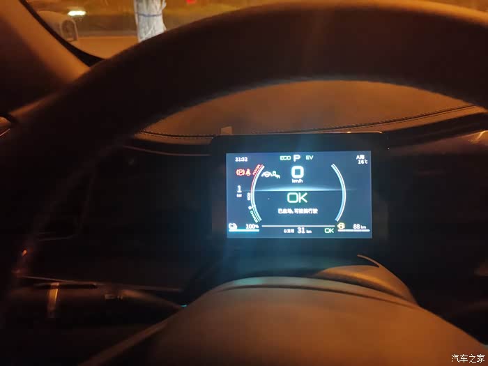 这是在4S店出发前,百分之百电量,没加油,里程31公里。