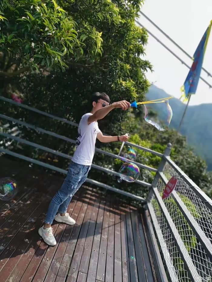 此友犹如小孩般玩着泡沫