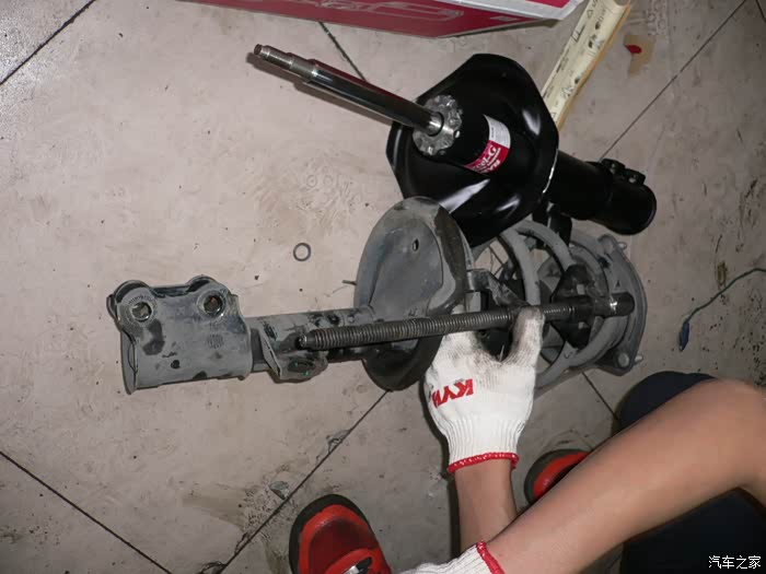 组装左前新的KYB减震器。