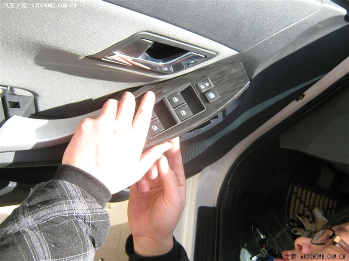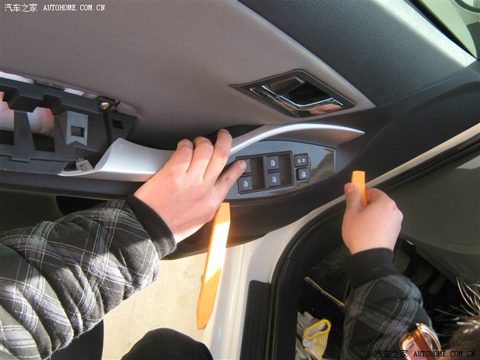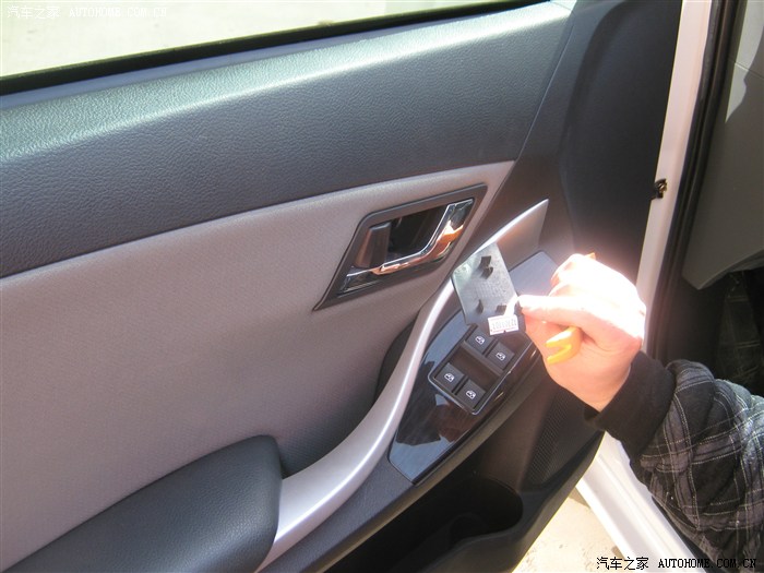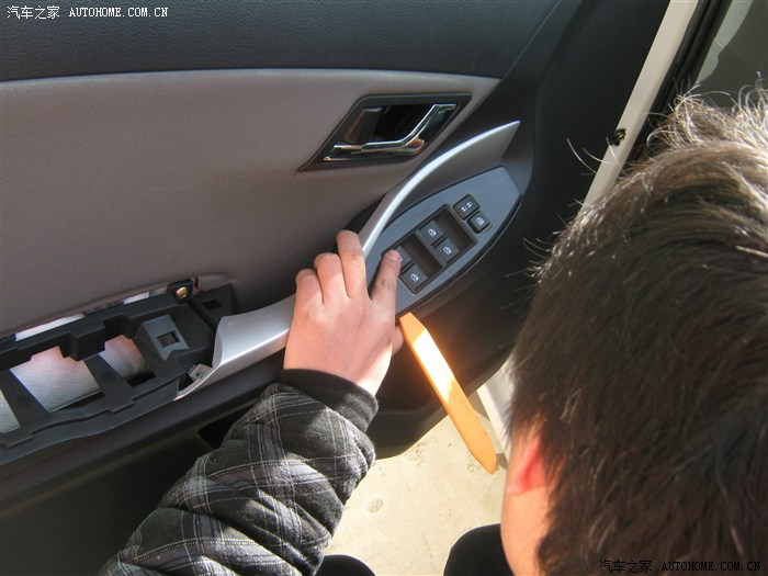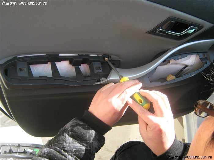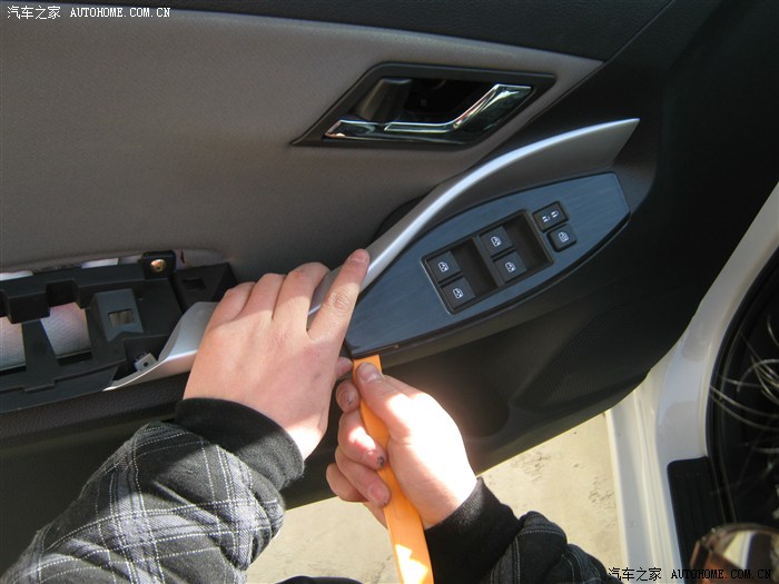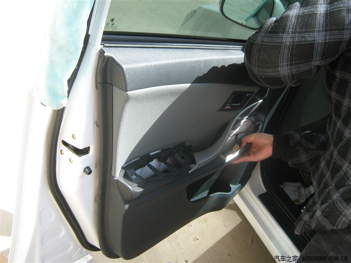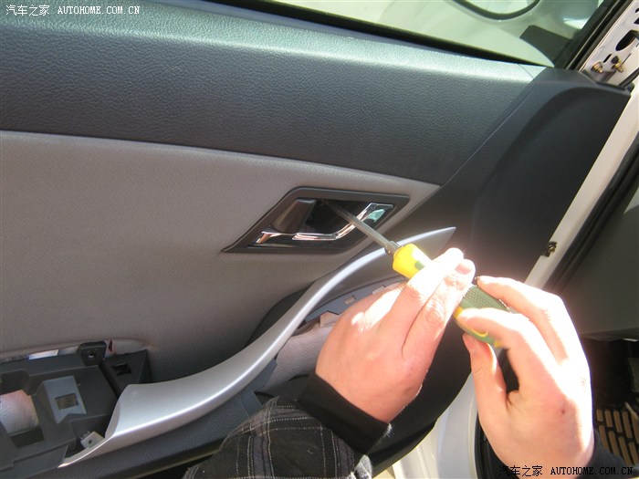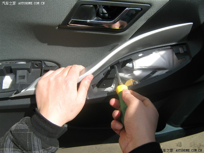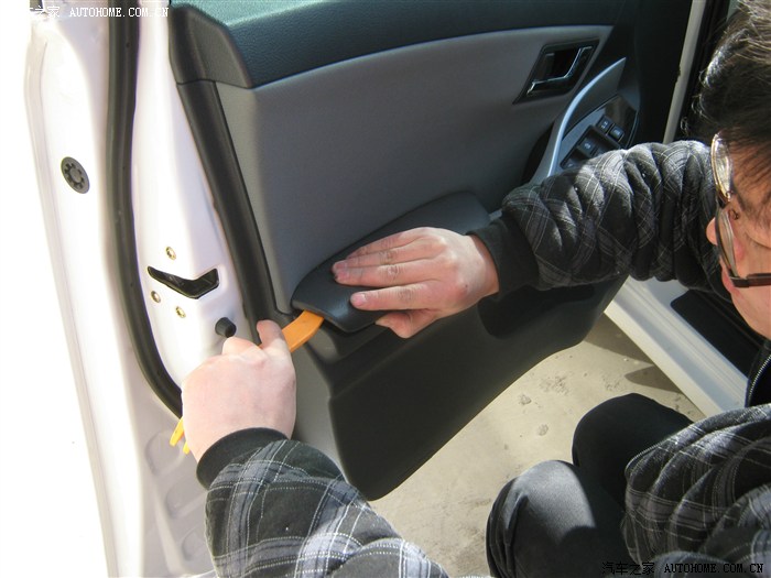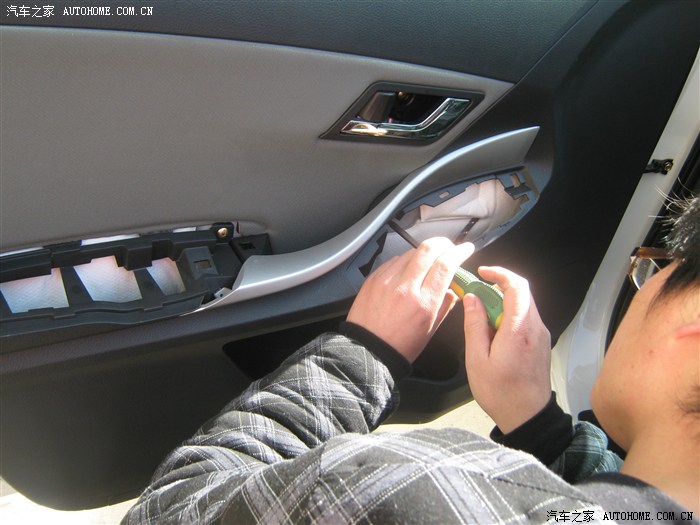 12,卸下螺钉后就开始撬面板了,面板有点费劲,从车门外侧撬开缝,就好了听见咔咔声就要掉了,撬坏好几个