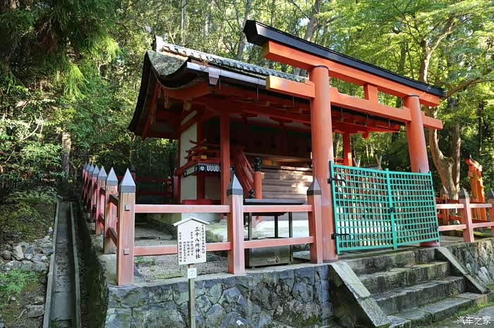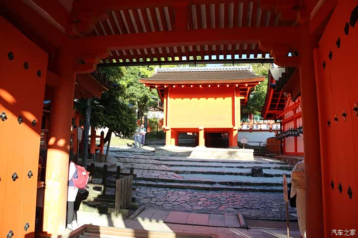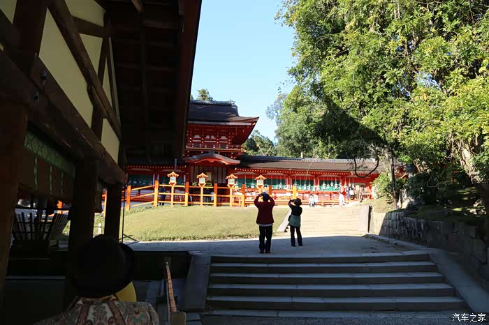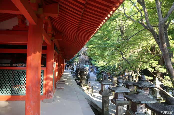 围绕本殿的朱红色的回廊与春日山麓的绿色丛林相映成辉