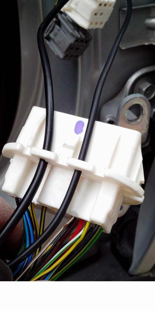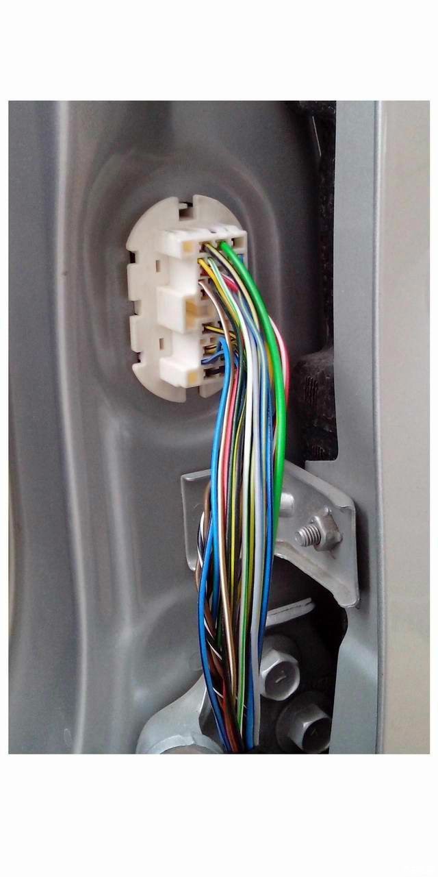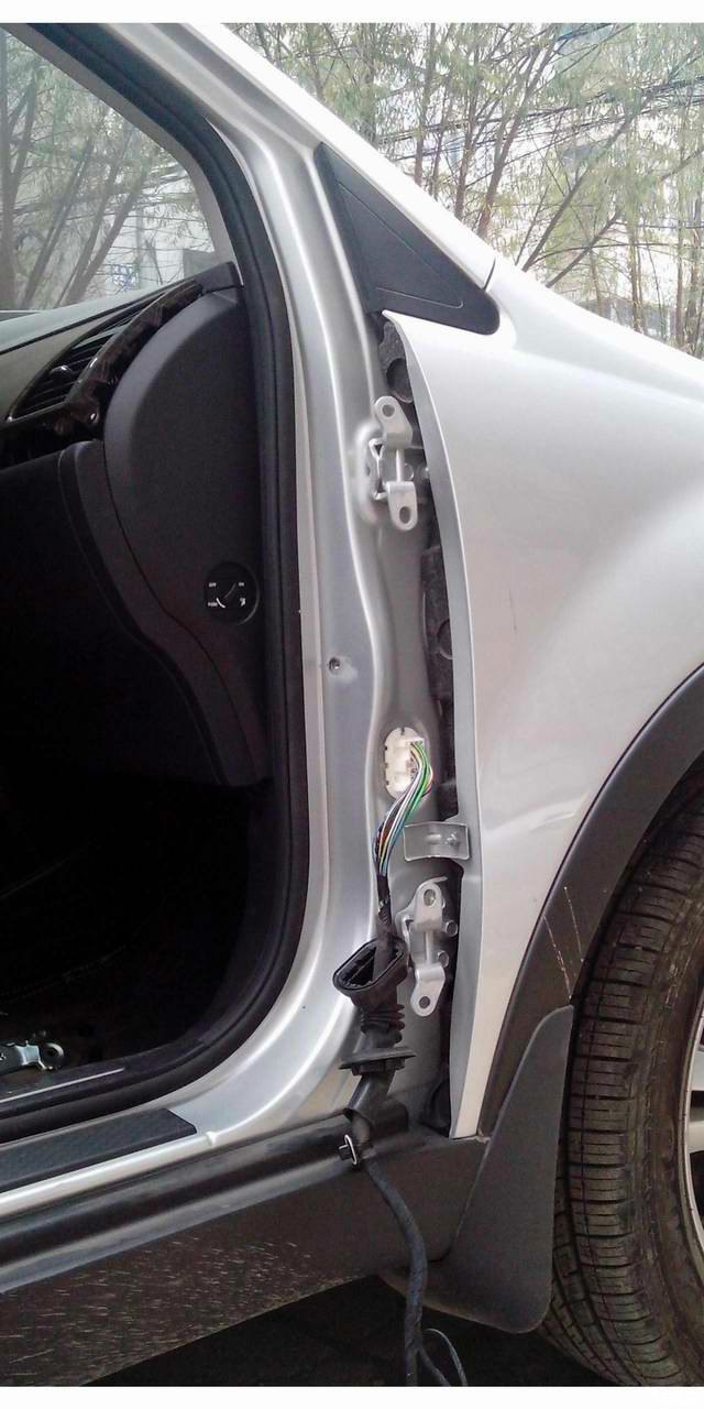正题:今天休一天,开始考虑从车内引出照地灯和侧视摄像头电源线,因车体线孔处采用插座和插头连接,没有空间进行穿线,经研究,决定拆下左右前门,翘出插座进行走线。