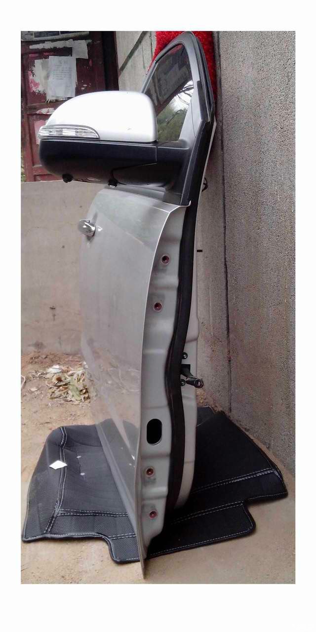 车门图片:后视镜下方已经安装了照地灯和侧视摄像头。门体上四个带锈迹的螺栓孔为车门铰链螺栓孔,下部长椭圆孔为车门线束孔。