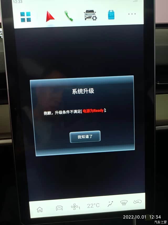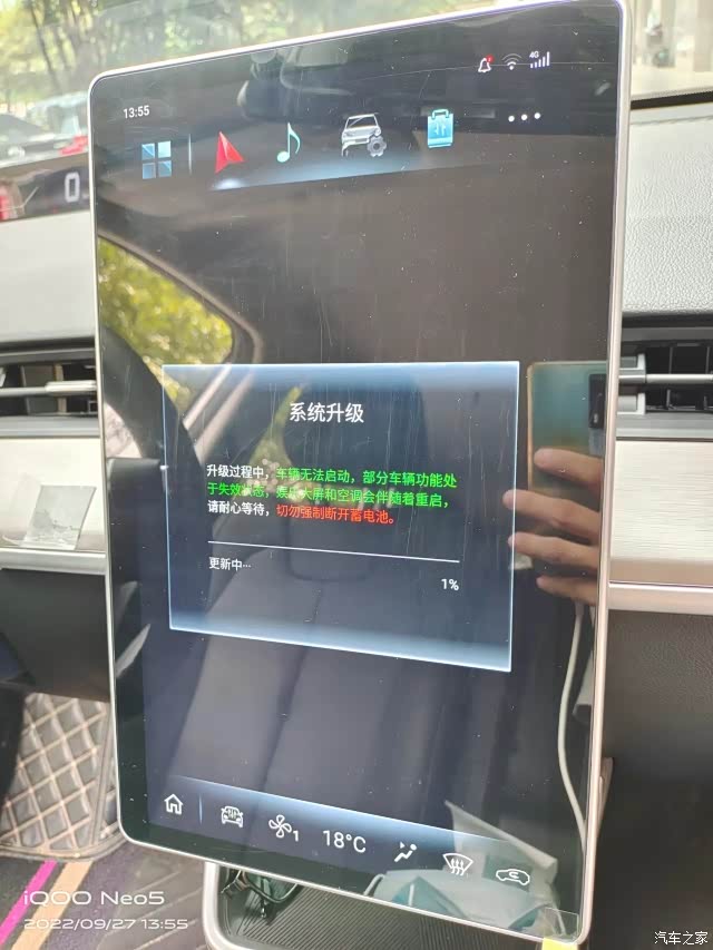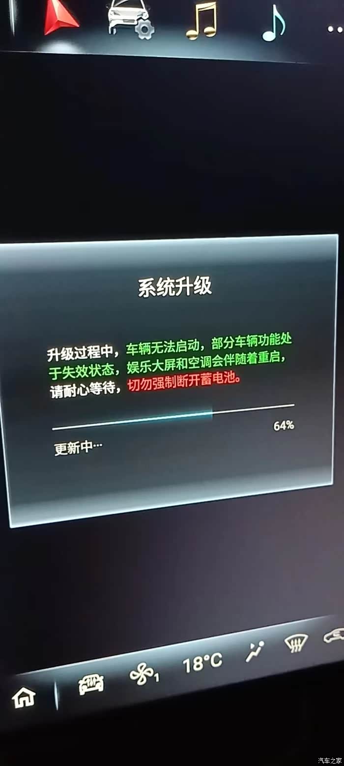 1?升级中车辆无法起动,部分车辆功能处于失效状态,娱乐大屏和空调会伴随启动。升级过程中不要强制断开?电源。如果切断电源就会导致升级失败。