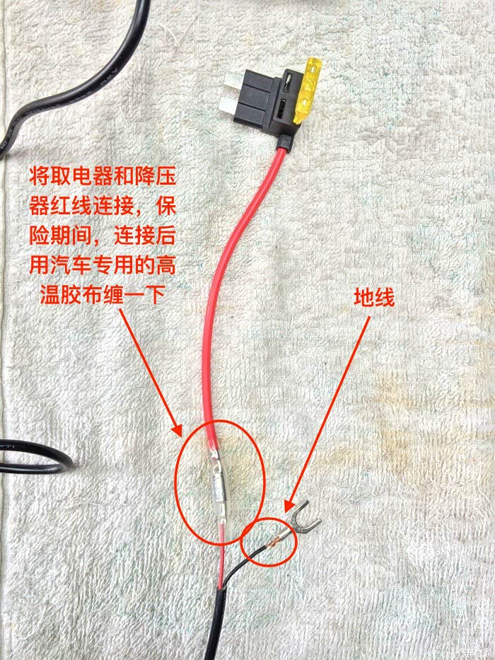 取电器和降压器某宝一搜一大堆,一般红色的是通电的线,黑色的是底线