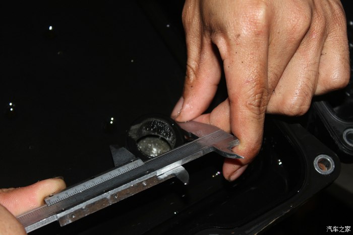 为客人呈现新旧油底壳,客人花钱要舒心,师傅做事要放心。师傅13年一如既往的服务所有客户。小师傅在用游标卡尺演示对比,确认所有物料是否正确。旧件由于一直拧着,会比新件直径小一点。