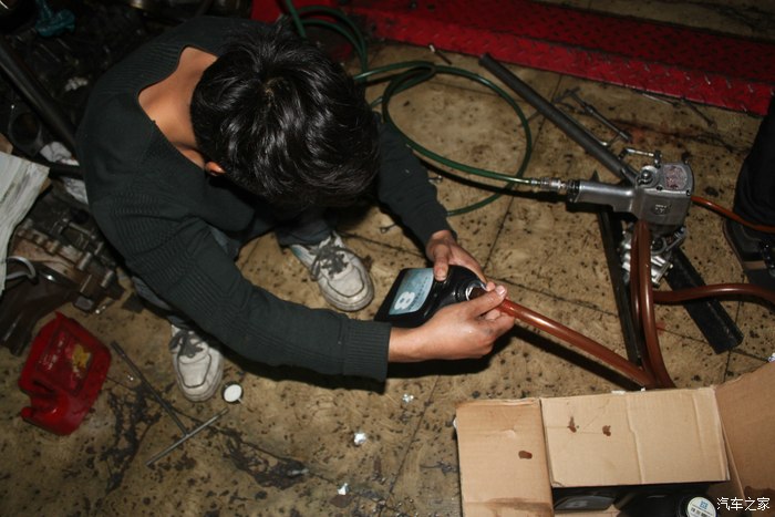 楼下有位专修厂的车友建议用专用机器,我们这个注油设备是师傅自制的,虽然看起来粗糙,但是用了很多年,非常顺手。
