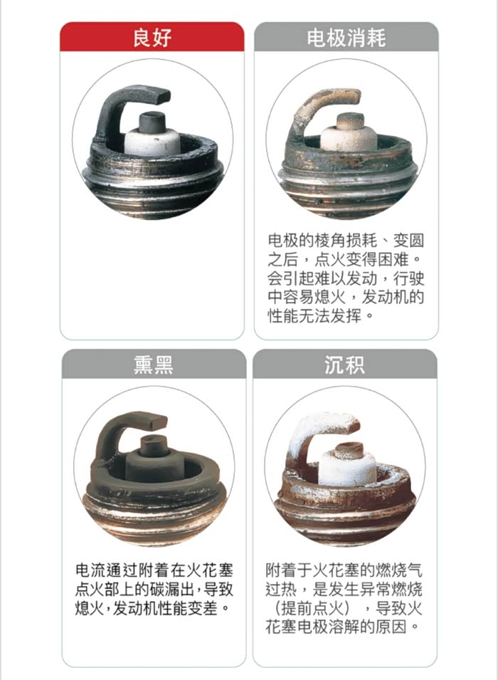 但是网络上一直流传着一个故事,就是帕萨特曾经3万多公里火花塞熔断导致发动机顶缸,所以大众改成了2万一换,所以综上建议每两万公里打开检查一次比较合理,而不是强制更换,这样比较合理,那如何判断火花塞什么时候该换了呢?看看NGK官网的建议图片