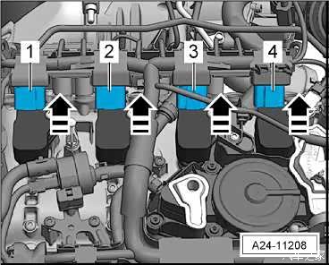 用钩子 -CT10118-或 -T10118-沿-箭头方向-断开点火线圈插头连接-1-至-4-。
