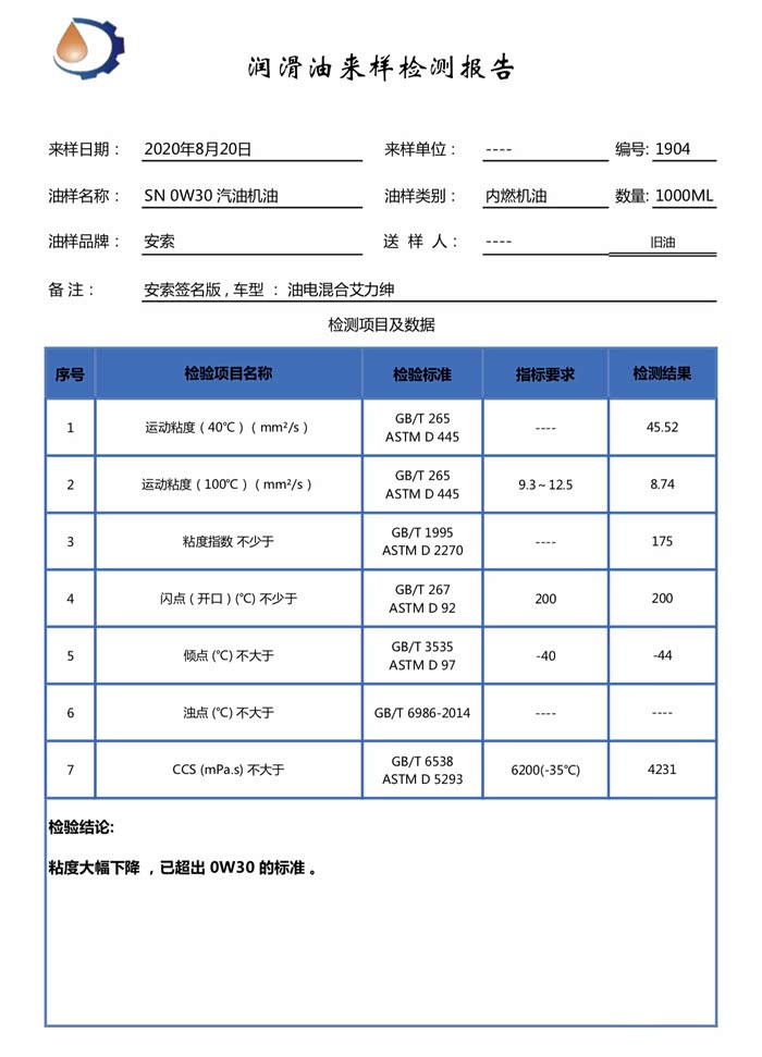 混动艾利绅使用安索签名030跑了7200公里后的废油实测数据