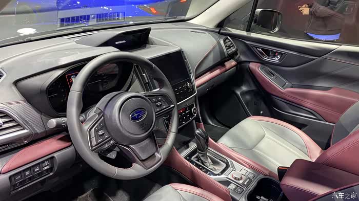 车型内饰采用黑色与波尔多红的组合颜色,仪表盘内部也加入了红色元素与STI标识,兼具高级质感与运动感。