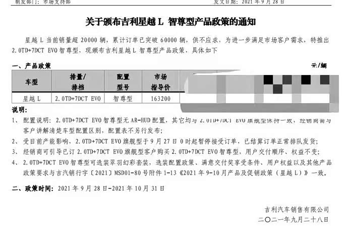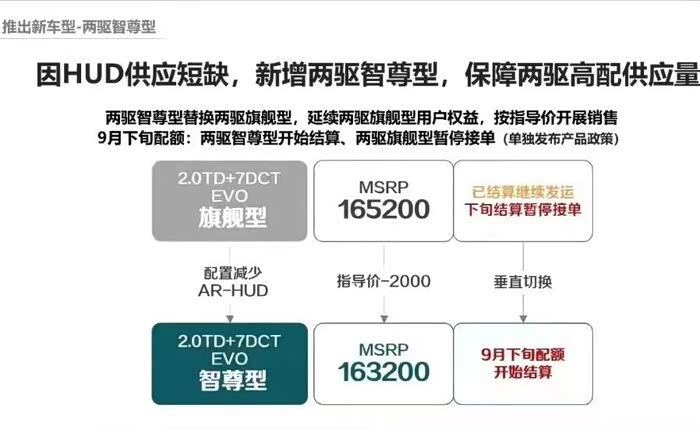 本人是9.7号在4S店交了5000快订购了一台星越L两驱旗舰版。9.28号销售跟我说,因为芯片短缺取消了HUD抬头显示,在旗舰版的基础上减少2000快钱,我当时是直接不同意的。因为我就是看中HUD抬头显示才订购的两驱旗舰版。后来咨询了400吉利官方售后,确定是因为芯片短缺取消了两驱旗舰版,而且后期无法加装,是9.27号发布政策取消两驱旗舰版HUD抬头显示,说的是只要是在这之前经销商没有跟厂家结算的全部取消两驱旗舰版的抬头显示,减少2000块钱。