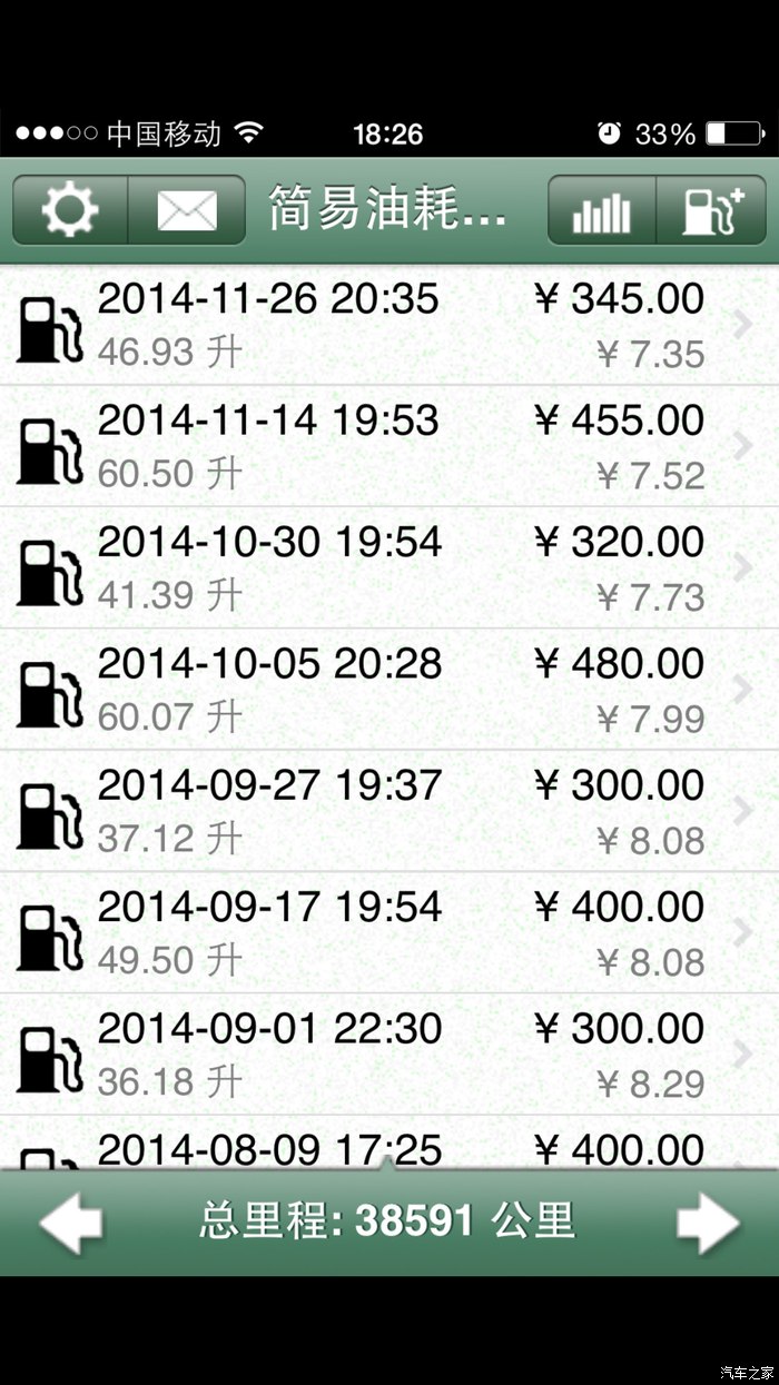 我上下班的路都比较堵,白锐虽是2.5的排量,但油耗我还是比较接受的,平均一般在10个左右,如果是高速(车内满人,后备箱也装满大概300斤的东西)一般是6-6.5。每次加油我都会记录下来,时间,当时油价,加了多少升,加的什么油,总油价。因为我一般就上下班开,偶尔出出去,接接老婆(我和我老婆的上班方向是想反的,她往东我往西),所以一般2星期加一次油,一次400左右,有时加满,一个月就加2次左右