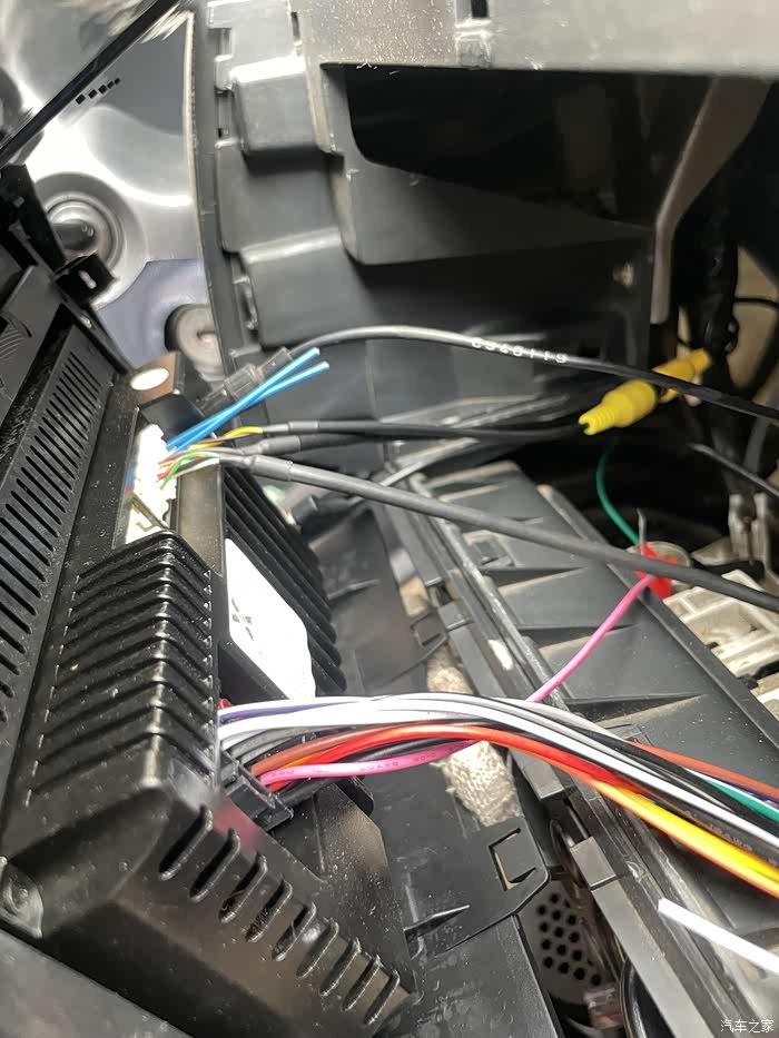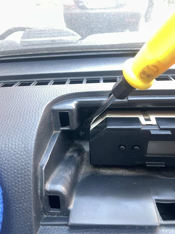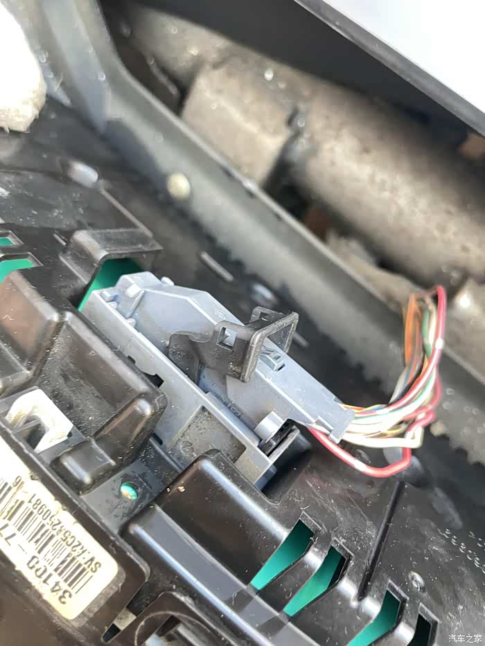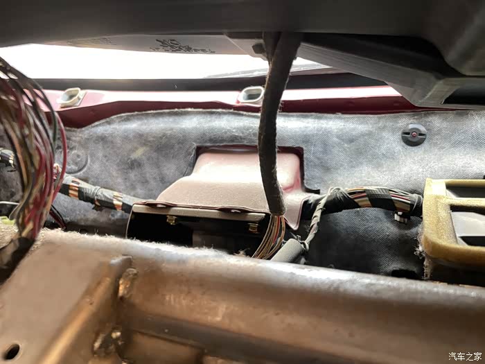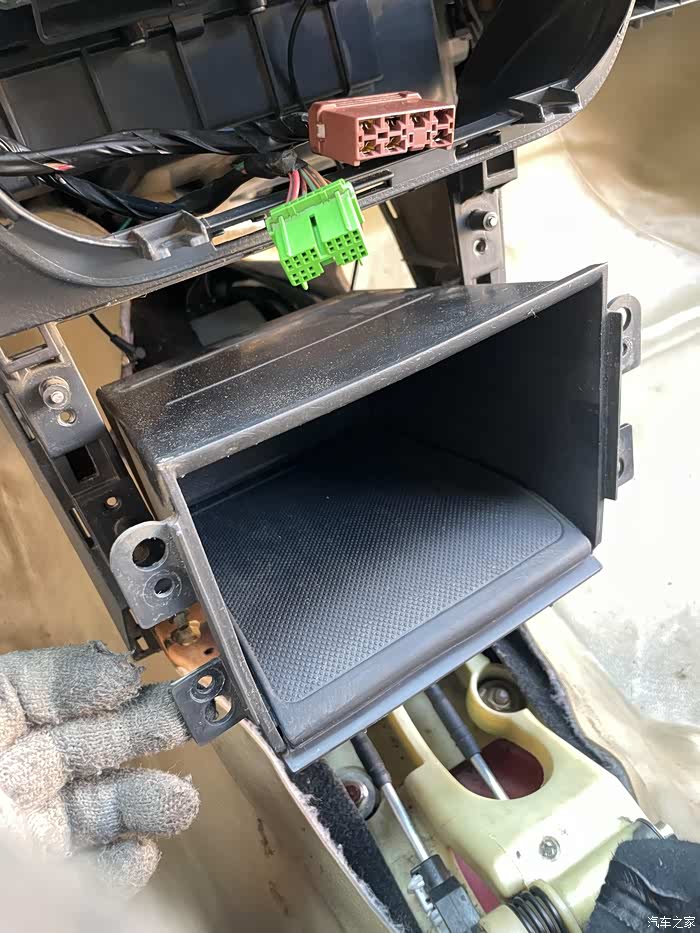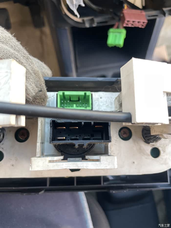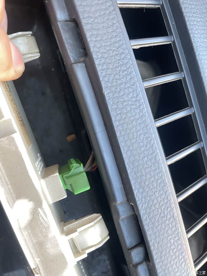 这里拍照片方便记忆位置,因为之前我拆卸过,所以轻车熟路,后改的大屏,没有老款CD的两边10号套筒的螺丝。所有线束都拔掉,直接背部推卡扣就下来了……对了,别忘记中间顶部出风口中间那有双闪灯线束插头,要拔掉。看下图……