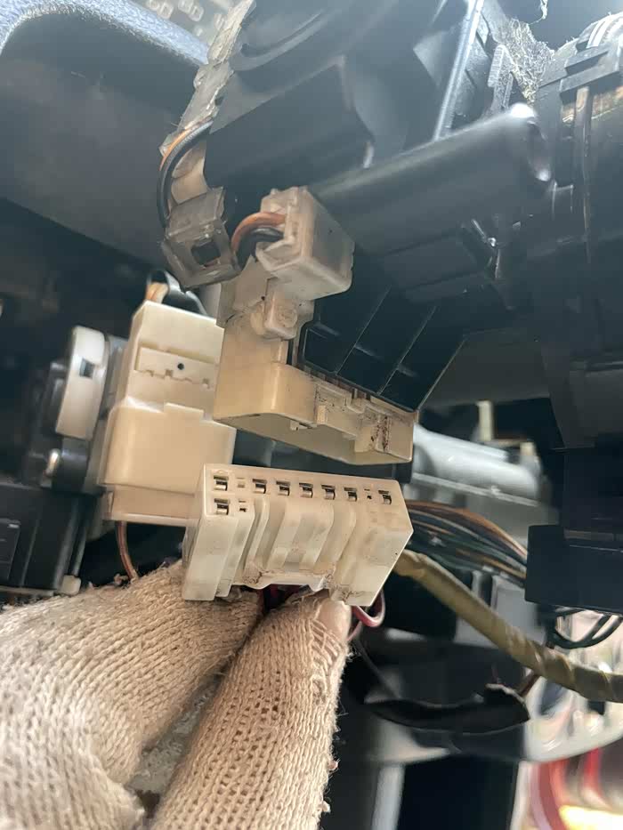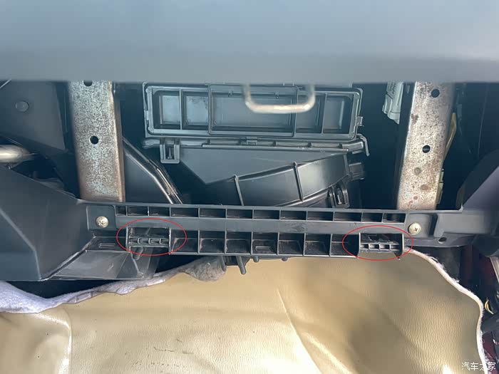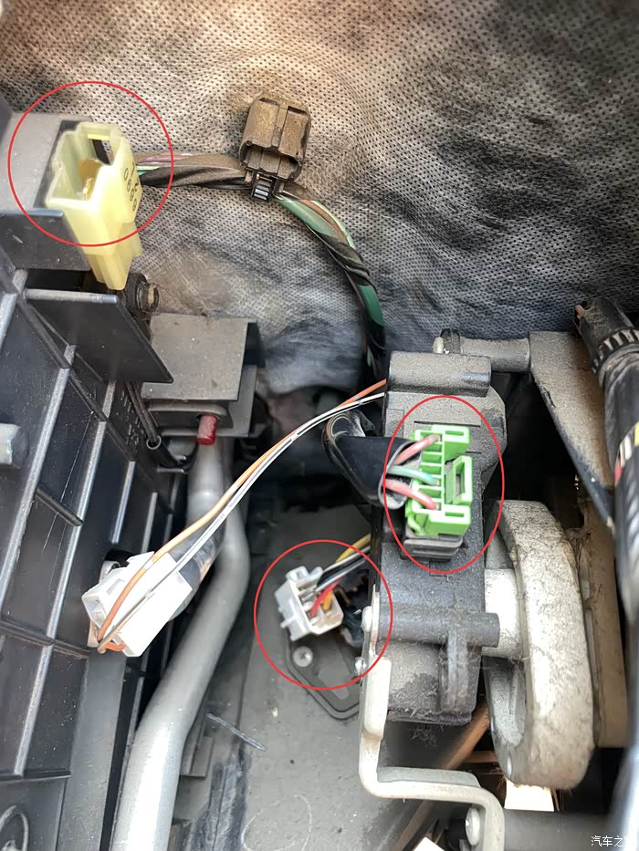 别的地方拆完,空调这里就好拆了,背部上下红圈处有两组线束,拔掉,然后趴在方向盘转向柱向内看,有翻板的下白上黑的拉线,看下图……
