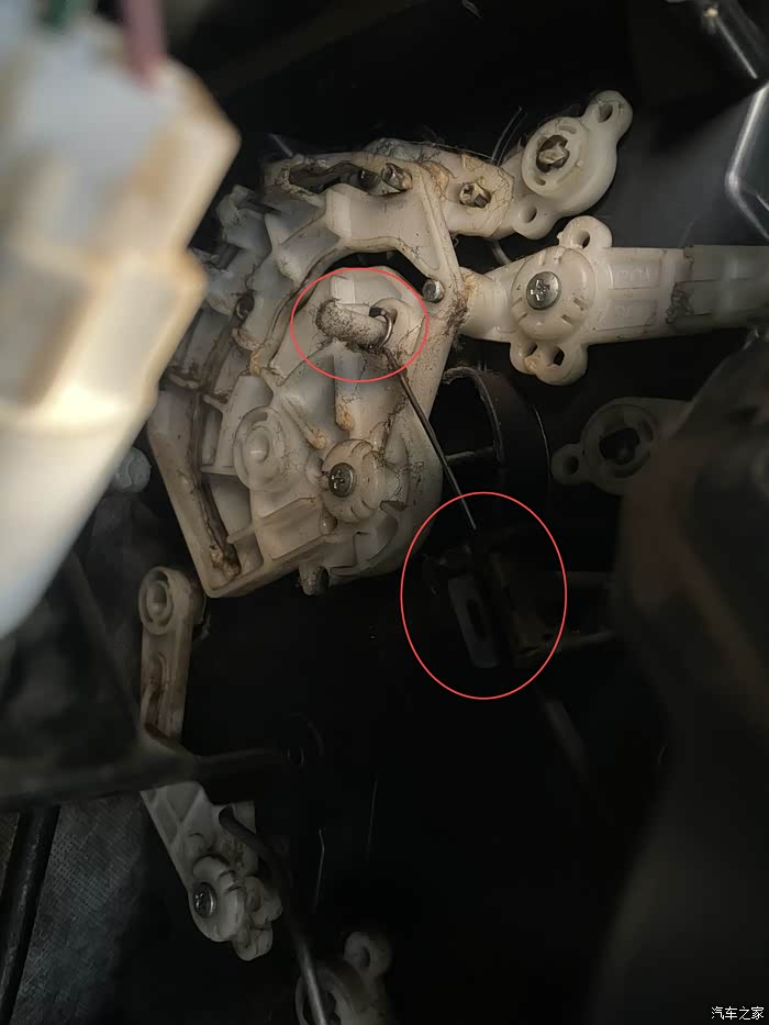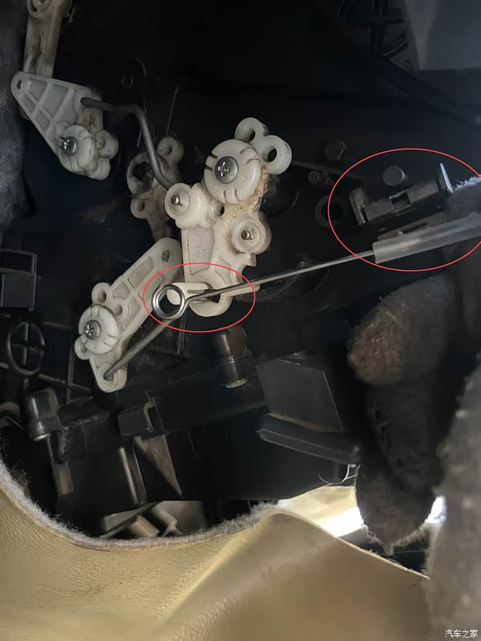 看到那个白色的杆没(红圈处),用一字螺丝刀把外突的部分往里怼,小拉线圈就出来了,还没完事,旁边还有卡子(红圈处),得稍用力拔出来,此时整条线才完事,上边那根黑色的同样操作。看下图