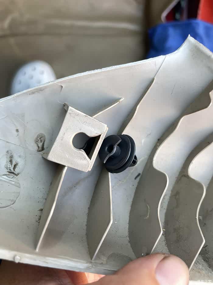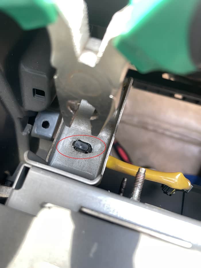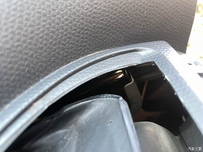 上图四颗螺丝卸掉后,副驾驶安全气囊就可以活动下来了,就剩这个黑色卡扣气囊线连接着,稍微从上面打开面板一些缝隙,看到卡扣背面结构,用钳子夹住两边,卡扣就掉下去了,至此,整个副驾驶气囊面板,就整体掉下来了。