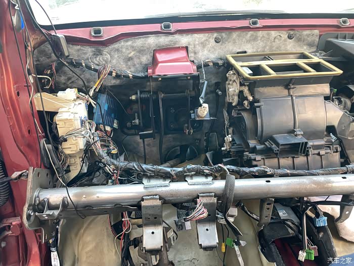 大梁我就拆卸到这里,线路啥的,就局部拔下空调总成那边几个线束,其余没都拿掉,空间已经够取下暖风水箱总成了,看下图……