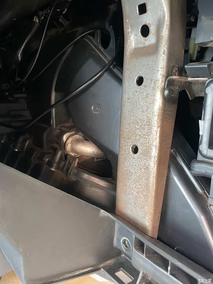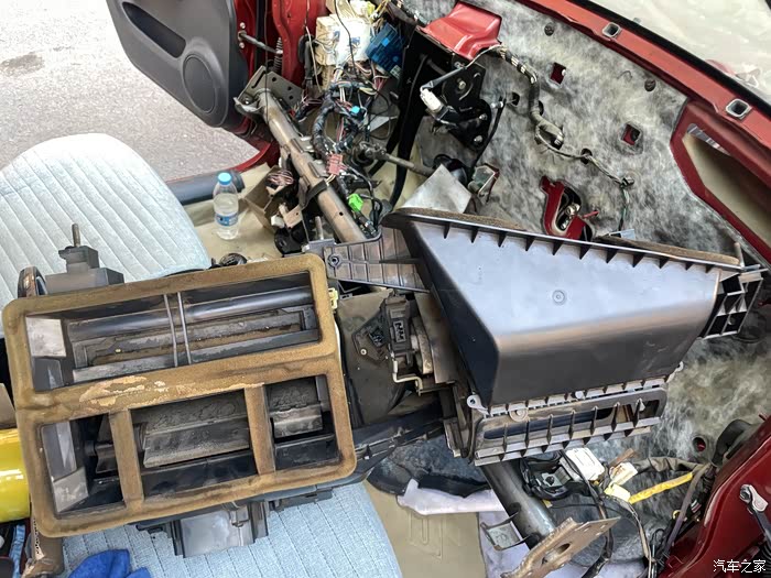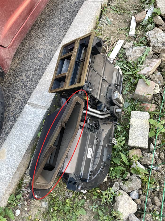 接下来,继续回到车内,钻到扶手箱下面去拔掉空调的,制冷的冷凝水排水管,挺紧的,但是晃一晃也能下来,接下来,此时空调总成,直接手拿下来就行了。至此算是拆卸完成了,历史3天假期,不容易呀,看下图,空调总成……