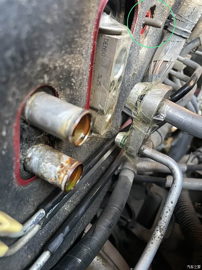 看到蒸发箱管路旁边,右上那个绿圈内没?螺杆没有红色油漆的,另一颗螺丝就在这里,拧掉,至此,加上雨刷器左侧绿圈的三颗螺丝,一共五颗螺丝,是连接车内空调总成的,都拿下,再把连接的管路拿掉,车内空调总成就下来了……累死啦。流汗……对了,空调制冷那两个铝管接头中间有颗10号套筒的螺丝,得拧掉,管路才能拔下来,有皮垫,所以有些紧。注意,拔之前,在那个粗一些的低压铝管上,标有L的小盖子拧掉,放掉冷媒。我没在那里放,直接拧图上那个粗的铝管子接口处,慢慢放掉的,没一下子全拧掉,要不喷着自己就不好了。这里面还需要注意很多,因为放掉冷媒,一些冷冻油也流失了,后期加注时得注意别忘记补一些冷冻油,一瓶几块钱70毫升的好像,润滑压缩机的。铝管都拿掉后,就最好都密封上,或者塞上干净的东西,放防止进东西。我直接大胶带贴上了,省事。看我那个小水箱的防冻液进出口,都锈蚀透了,我说怎么打胶水都不行呢。补几张文字里描述的细节图……如下