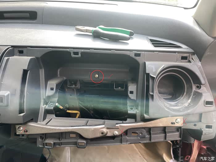 来张多媒体拆掉后的照片……这个边缘最好别用金属撬,容易花,我的车不在乎了,但是注意点总好一些的。看到那两颗红圈里的螺丝钉没,拧掉放盒……接下来拆方向盘位置,看图……
