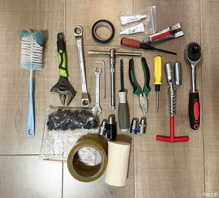 准备了一些用到的工具,就参考吧,我就是用这些拆的,辅助的剪刀啥的,没放,毕竟家家都有……螺丝松动剂啥的,可以买点儿,不好拧的涂上点,哪里缺润滑的顺带抹点油……