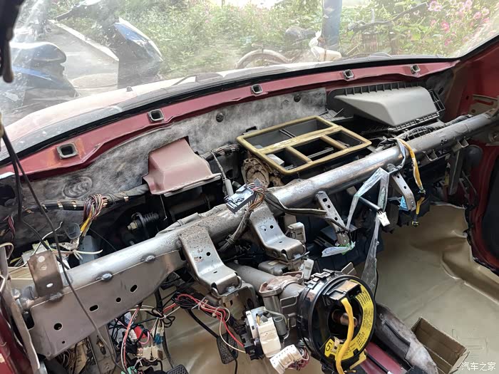 拆掉后的样子,都是灰,好像进过沙漠似的,正好顺便清理下。方向盘和横梁连接着,不好拿下右边空调总成,所以还得拆方向柱,下面四颗螺丝,老紧了,看下图