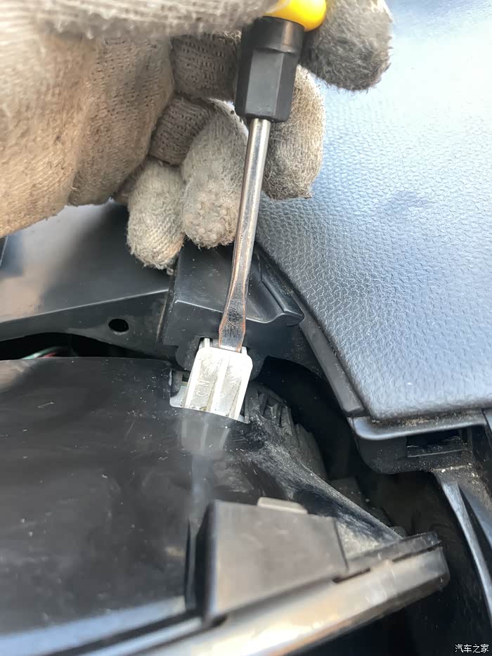 手套箱底部安全气囊连接线,用一字螺丝刀轻轻撬中间那个小黄盖儿,就起来一毫米多,然后用手往下拔,线就掉了。
