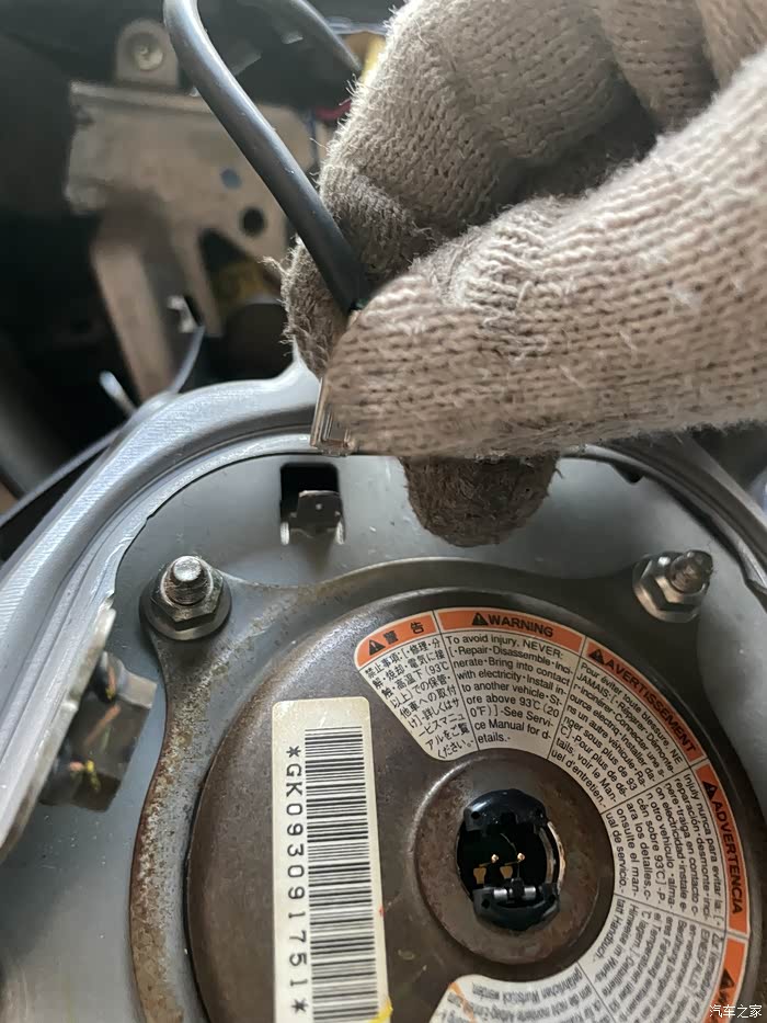 气囊背面图……看见排线了吧,准备拔吧,不过要先前把电瓶负极断掉,要不别不小心把你给炸飞了,哈哈,安全第一嘛,后边那个铁片一捏往上一提就下来,黄的小盖子一字螺丝刀往上撬一下,用手就能整体拔下来了。慢慢试着拔,头一次有点紧。