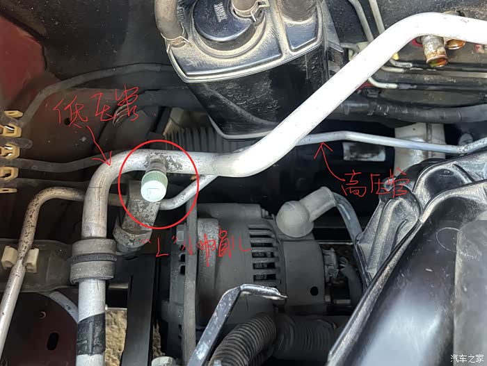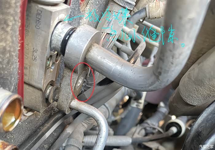 红圈处有颗10号的螺丝,我记得,拔粗管的时候感觉到有气体出,我就停止了,慢慢放掉了,放了一宿,正好赶上黑天了