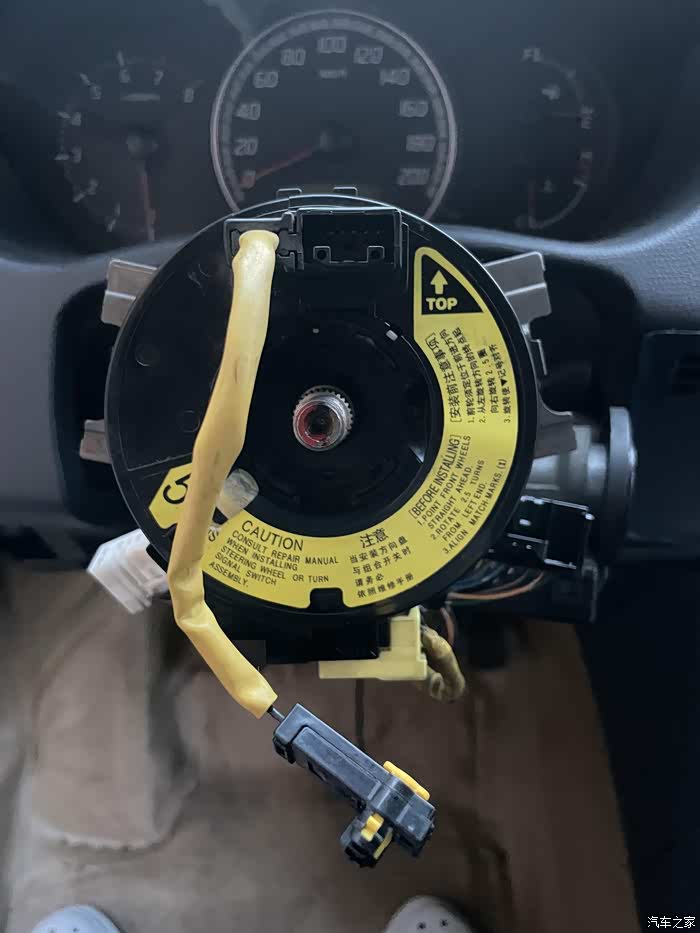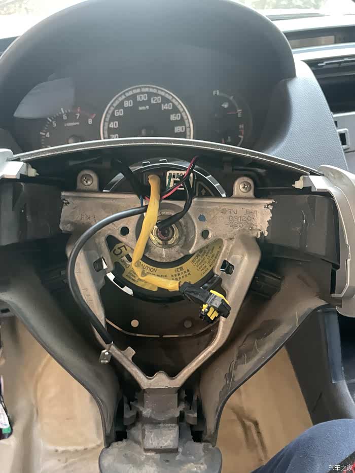 成功拿掉方向盘底座后,露出游丝,一个螺旋导线的东西,大家还是记住这个游丝的位置,或者胶带固定一下,别安装时弄做了就麻烦了,这东西也很重要的,方向盘按键供电都靠这个盘盘呢。