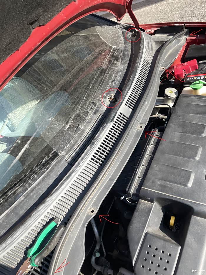 车外先把雨刷器两个防雨帽儿一字螺丝刀拿掉,用好像10号扳手吧拧掉螺丝,雨刷就下来了,一般雨燕这车就是8号,10号,12号套筒这样,绝对够用,但是拆方向盘用了13号,还有14号。大家有就行。话回来说挡雨板,都是卡扣,弄不下来暴力拆卸就行,网上很便宜,几块钱一大堆,我之前有,就直接撬掉了,看红箭头的位置照片不全,一看就明白。
