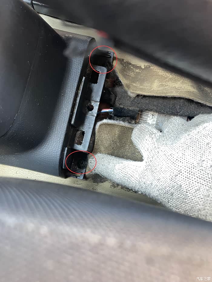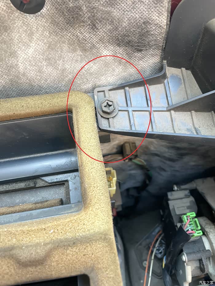 红圈处,就是手套箱底部的两个插进去的卡扣,找点巧劲儿拔,很方便,别硬拽弄坏了,顺带所见处的螺丝我都拧掉了,所有螺丝最好找个盒子,都放进去,别丢了。。