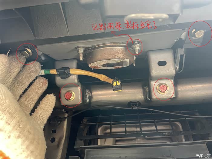 红圈处上边两颗小一号螺丝,好像10号套筒,下边横梁处两颗大一号的螺丝,应该是12号套筒,时间长记不太清楚了,差不了太多,中间气囊的底部螺丝不用拆,这时就剩那个黑色卡扣了,往下看……