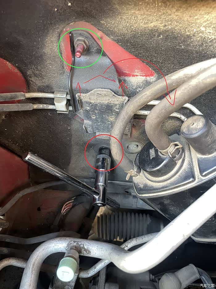 找到碳罐这里,碳罐红色箭头往上提就拿下来了,这个设计给满分,背面底部红圈内有颗螺丝拧掉,上面的绿圈,注意,注意,只要这种红头螺丝不要动,是固定挂件的,不是内部连接空调的螺丝。拧了没用,浪费时间。机舱下面这里一共两颗螺丝,这是其中一颗,再找另一颗,看下图……