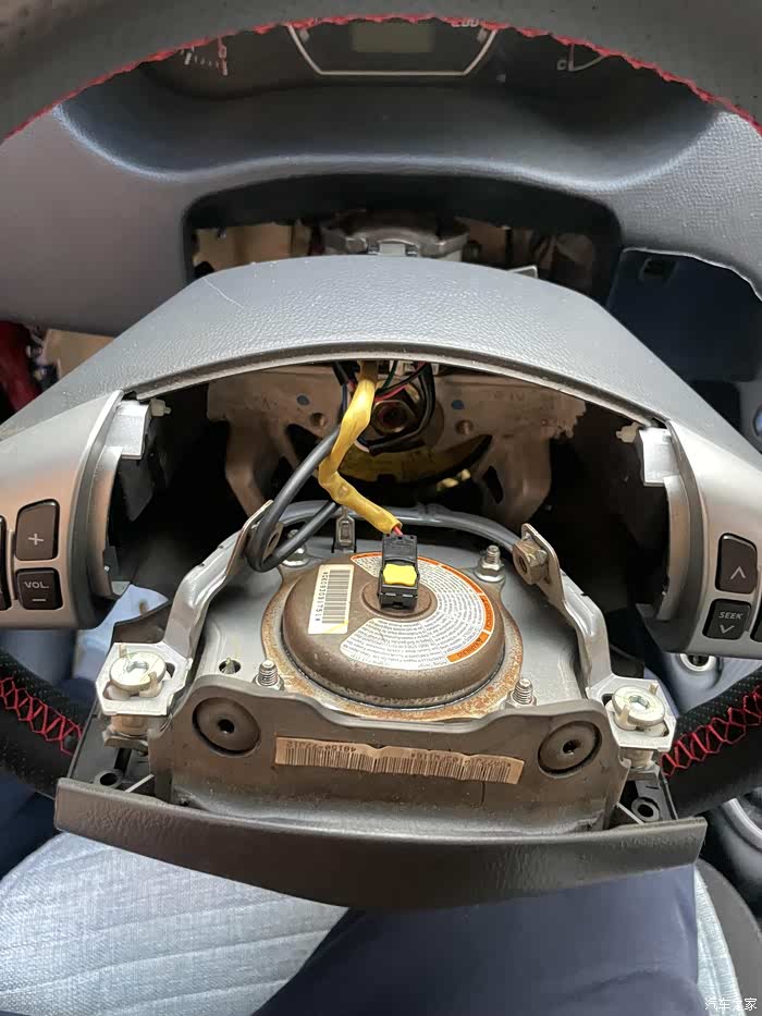 接上图,钥匙孔那边的螺丝,拧松掉,方向盘中间气囊的盖就可以活动下来,背部有排线,要拔掉,看下图……