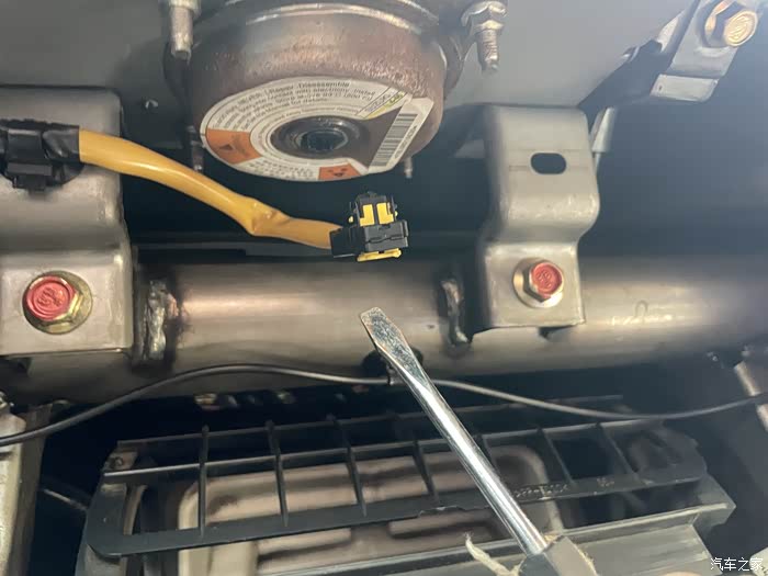 露出方向盘底部的基座,还有那颗原始状态的螺丝帽儿,这时看见图中白色的线束扎头没?是多功能按键的连接线,卡扣的给它拔掉,然后开始拧螺丝,14号套筒。看下图
