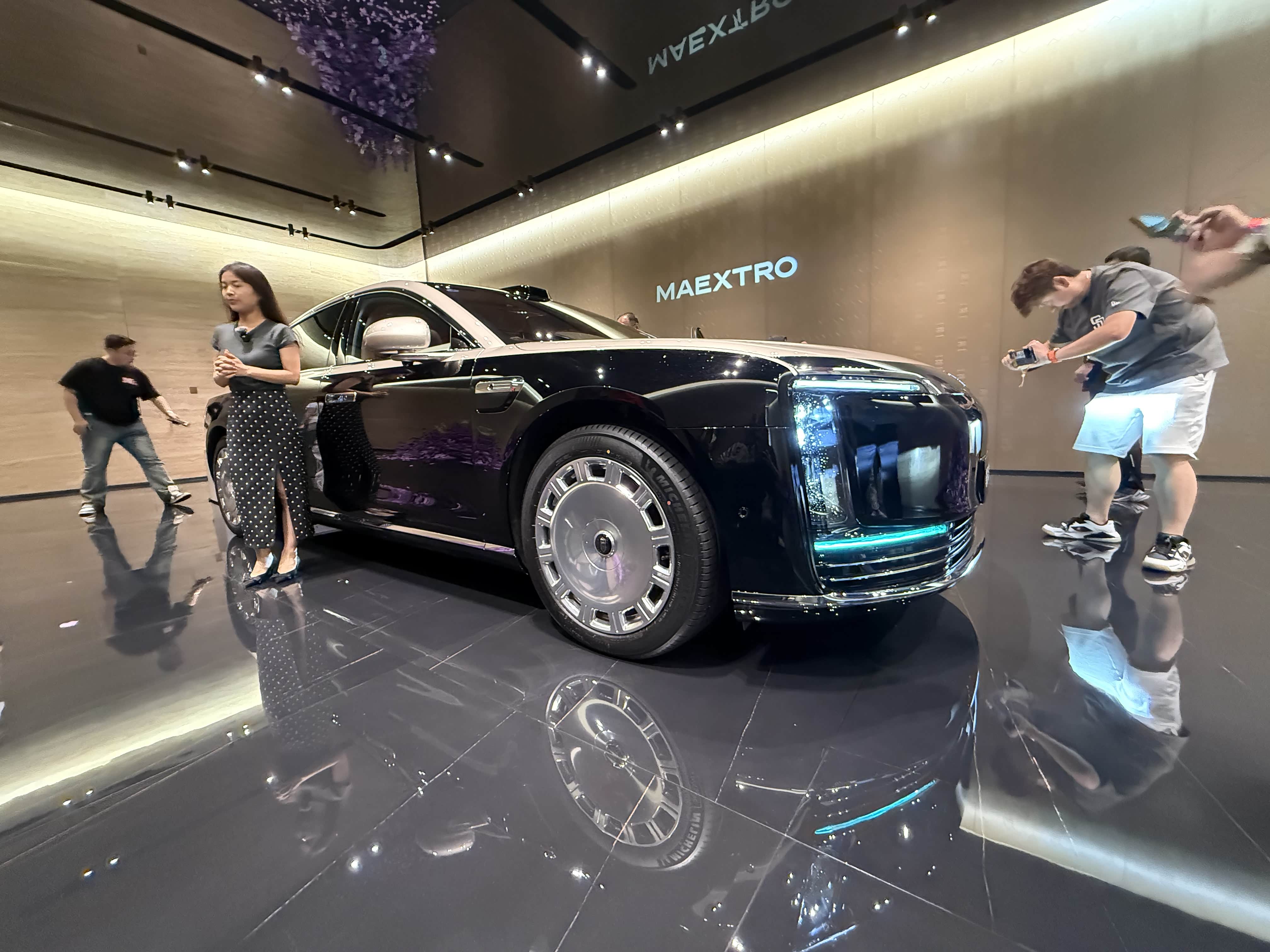 一下就被尊界S800那独特的外观所吸引。整车采用了纵横星瀚设计语言 ,将现代科技与东方美学完美融合,流畅而富有力量感的线条,勾勒出极具辨识度的车身轮廓,每一处细节都散发着独特的魅力。前脸大尺寸的进气格栅,搭配犀利的智能交互车语大灯系统,集成ADB多光束智能大灯和DLP投影功能,配合华为车语系统2.0,打造出创新动态光毯,不仅照明效果极佳,还能实现自主行车指引、精准跟随行车轨迹并智能调节光毯形态,像有一个贴心的小助手,在黑暗中为你保驾护航,这满满的科技感,瞬间就抓住了我的心。车身侧面,修长的线条搭配大尺寸轮毂,运动感十足,智慧电动门系统内置毫米波雷达并联动固态激光雷达,能智能感应障碍物,自动调节车门开启角度,最大可达77度,开门的瞬间,仪式感拉满。摘星门把手的设计灵感源自“手揽月摘星辰”,独特又浪漫,当手靠近,仿佛真的能触摸到星辰。车尾贯穿式的尾灯简洁大气,双边共四出的排气布局,彰显着强大的动力性能,还有那96.3%超高镜面指数车漆,经过超170道工序精心打磨,在阳光下闪耀着迷人光芒,奢华感扑面而来,我站在车旁,不停地拍照,每一个角度都堪称完美,这哪里是一辆车,分明是一件精美的艺术品。