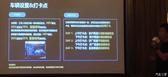 出发前服务人员讲解了车辆驱动原理、车辆设置、途径路线等信息。其实试驾到后面发现,DM-i不需要向以往的DM车型那样根据路况做出过多的设置,HEV模式下无脑SOC25%+智能保电就足以应付大部分路况了,整个系统驱动方式调整还是非常智能的。