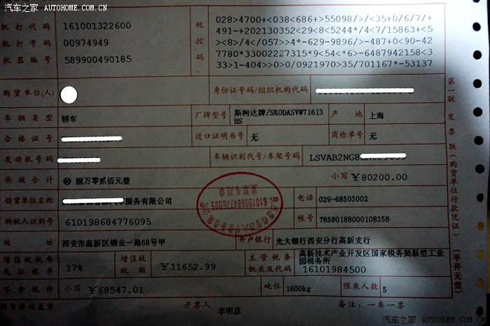近14点到四儿子后,合格证还没到,去银行取的人还没回来·····销售开始算账,说先付款,然后可以直接给车装潢,合格证到后就直接提车走人了,想了想就答应了,车价80200,首付40% ,贷款48000,金融手续费3060(貌似全西安市统一,***的),续保押金2000.捆绑的全险5600+挂牌费710.购置税预付8400(凭票多退少补),刷卡完,开始贴膜,装挡泥板,最后近17点,合格证终于到了·······下面开始上图