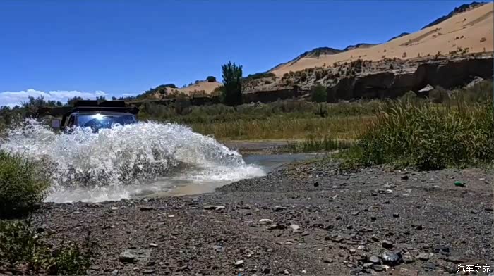 进入景区后一条是景区观光车路线,另一条是沙漠里的涉水线,全程没有铺装,一直涉水。由于是单车旅行,这成为了我这次行程中第一次小小的冒险。刚刚进入涉水路就看到了水池中间的汽车保险杠,当时我还犹豫了一下,后面有个陆地巡洋舰车队,他们过去把保险杠捡起来往边上一丢就冲进去了。这几辆陆地巡洋舰都是改装过的车,看见我这个绿牌车还是有点不屑的表情,一脚油门就不见了。我看了一下大概的水深,就跟了进去。毕竟是单车,为了避免陷车,还是按照自己的节奏安全第一。