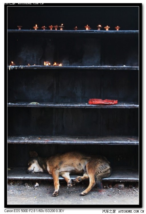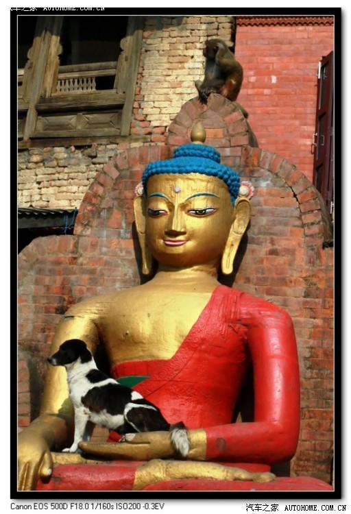 猴庙中的一瞥之四。无处不在的和谐。狗坐在佛像的怀中,猴子蹲在佛像之上,这才是我们心目中普度众生的佛祖形象。