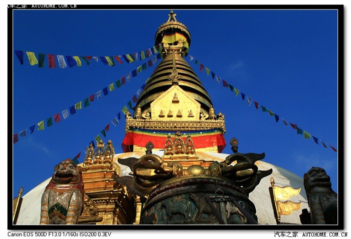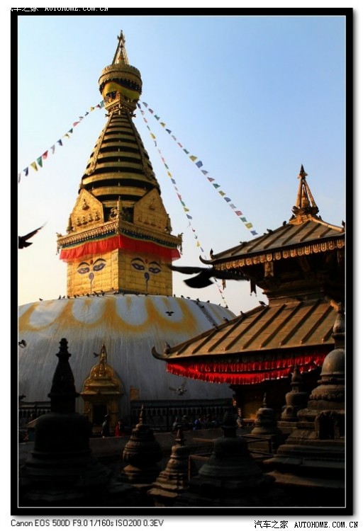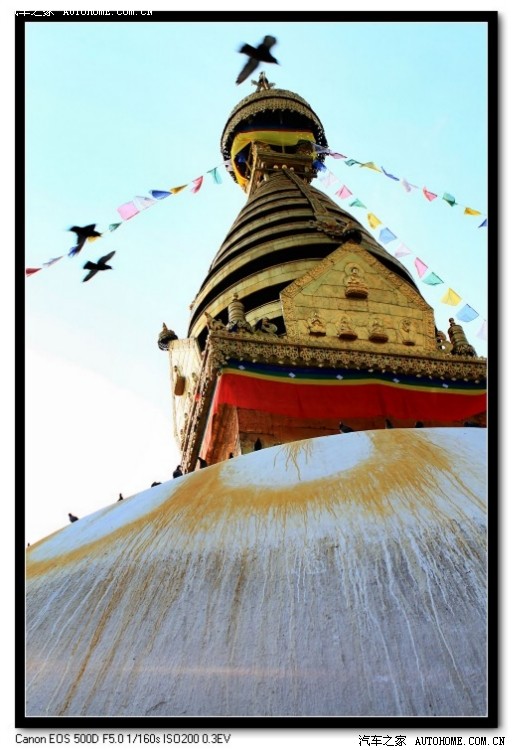 沿着台阶前行,路过一片玛尼石堆,再经过一片碑林继续攀登,终于在湛蓝的天界处,仰望到金光四射的大佛塔。高大的白色圆形基座上是四面绘有佛眼的金色塔身,经幡猎动,鸽子翱翔。佛眼可以说是尼泊尔的标志,在各种媒介上见过无数遍。今天目睹真容,仍然比想象中震撼。这就是为什么在信息如此发达的今日社会里,坐在家里其实就可以通过电视或者印刷品了解到全世界的美景,但许多人依旧坚定的选择远行,不计付出、情愿用自己的双脚去丈量每一寸土地的原因。间接之所见永远无法代替身临其境的触感,几十英寸的画面或者薄薄的一张纸,如何能把集天地之精华、聚五行之灵气的俊秀山川或凝人类之智慧、现千年之历史的建筑遗迹完整展现?换句话说,个人觉得一山一水、一草一木、一寺一刹都是有过去、有未来的生命体,只有在特定的环境下才能孕育而生,也只有去那里,才能立体感知到特有的氛围,从灵魂深处触摸到强大的气场。如同眼前的猴庙大佛塔,四方佛眼居高临下、无所不在的注视着苍生万物,彷佛加德满都的每一寸角落都可以被他所洞悉,没有什么能逃脱得了法眼之外。佛教徒们虔诚的顺时针转塔,在香炉里燃香供奉。流浪狗们横七竖八的躺在广场上甚至佛像怀里,数不清的鸽子、麻雀在整座猴庙上空盘旋,在金顶上小憩,在广场上闲庭信步。远处的加德满都山谷上空,4、5只苍鹰翱翔在湛蓝的天空里,总觉得他们就是神的使者,在佛眼的指引下,入世勘查。猴庙此地是以大佛塔为中心,各座佛殿散布四周。每一座无不雕梁画栋极为精美,再加上人与动物点缀其中,即便花费一整天的时间泡在里面,也绝不会腻烦。只可惜我们时间不多,无限不舍留待下次去填补缺憾。