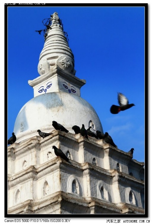 高大的白色圆形基座上是四面绘有佛眼的金色塔身,经幡猎动,鸽子翱翔。