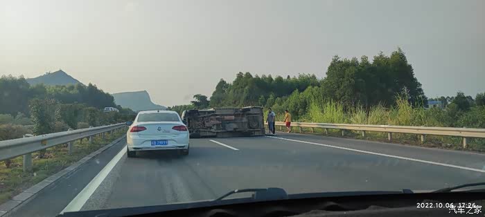 车流的速度突然变慢,好家伙,原来是这辆小货车侧躺在路面上,开车要小心呀