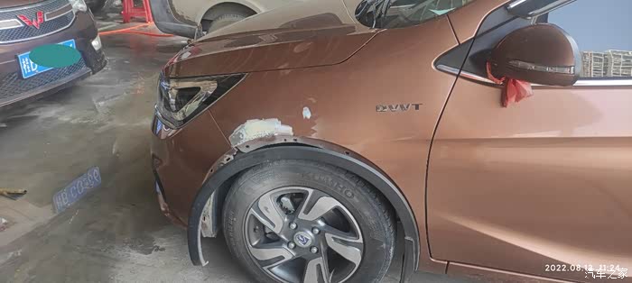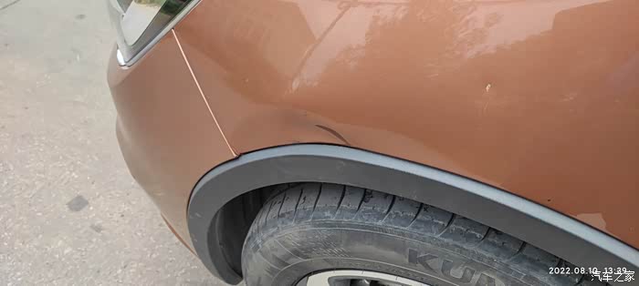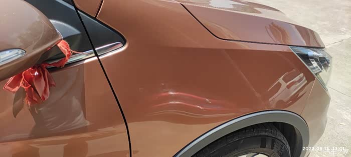 我问她擦对车子哪个部位,她说是左前轮上面的铁皮上。原来是翼子板,我就说问题不大,等我回家再说了。8月10日中午我要用车,启动车子后检查车辆,确实是翼子板